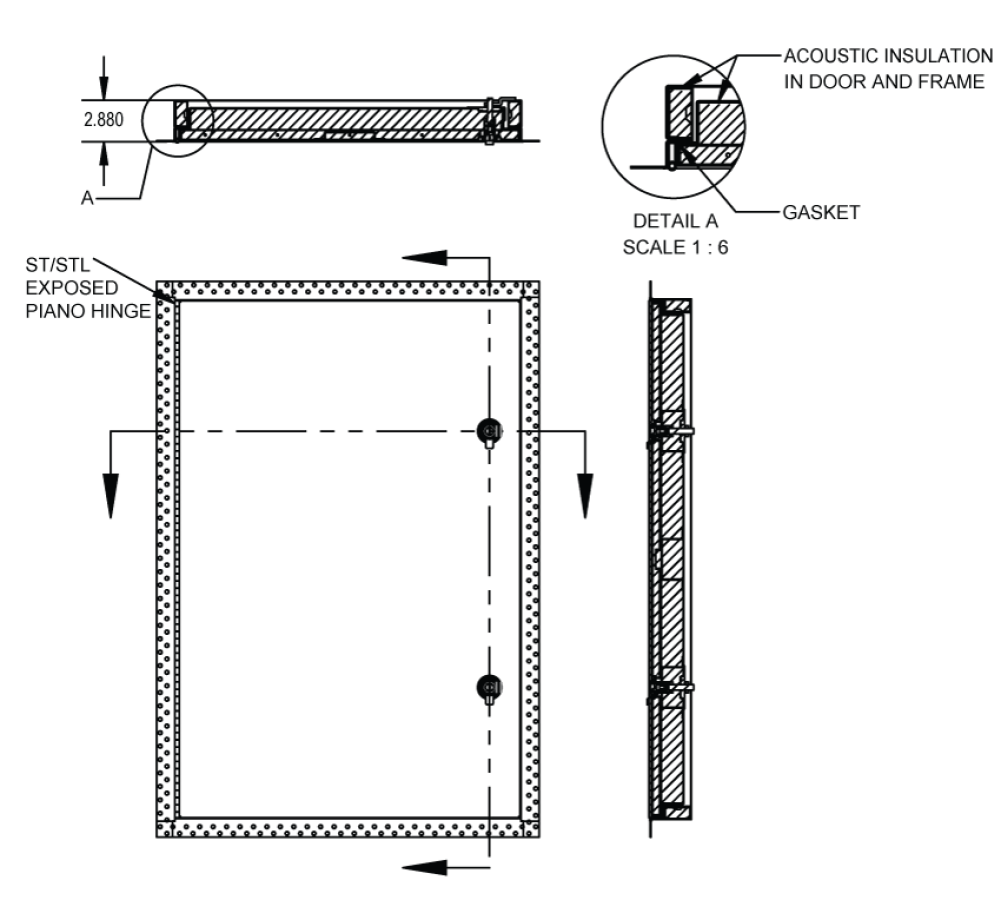 Door: 18 Gauge, encapsulated design with 2” thick acoustical mineral liner and 0.11” thick mineral filled vinyl barrier