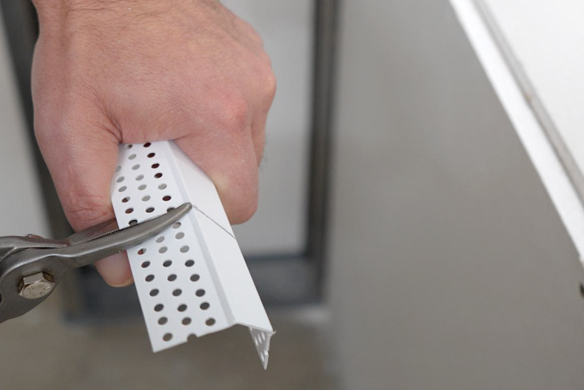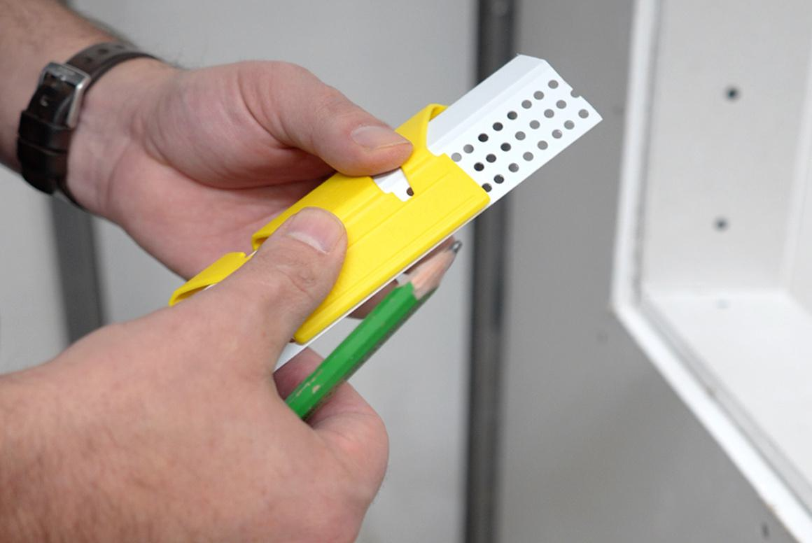 Using multiple pieces of Medium Chamfer Bead to wrap around a detail like a window or entryway requires precise, angled cuts where two beads meet. This miter marker makes it fast and easy to use a pair of snips to get the right angle for every bead, every time.